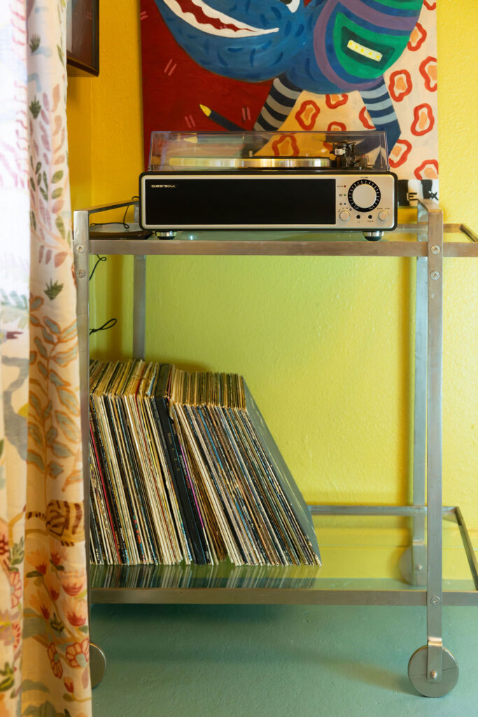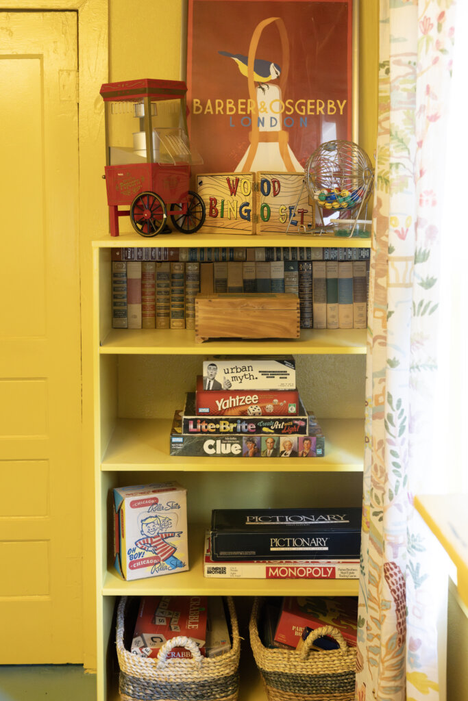 For families, there’s a high chair, Pack and Play with bottom sheet, and a cozy selection of children’s books and games. A vinyl player with both adult and children’s albums, a big TV, and Wi-Fi are all here to help you unwind your own way.
