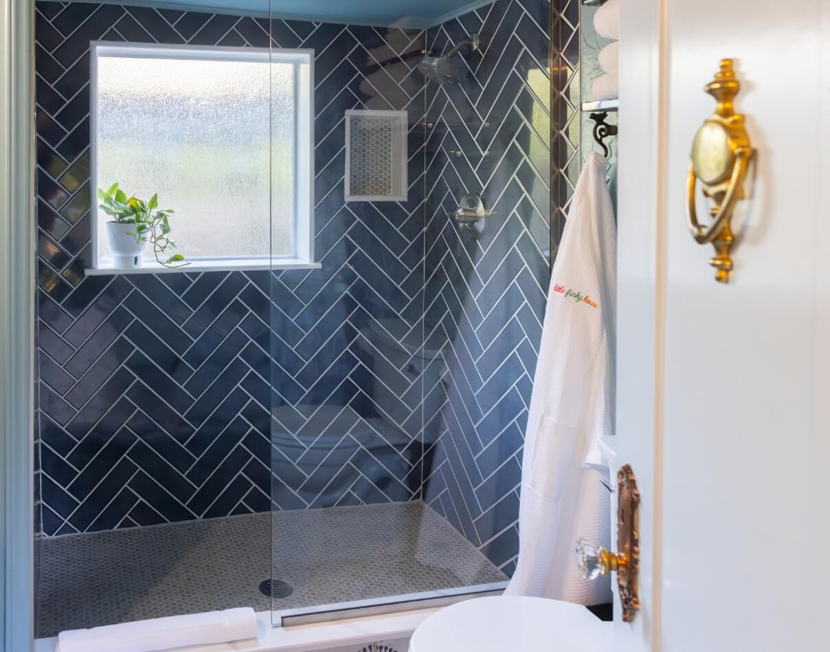 Fixtures lend a warm, timeless touch against the cool tones, while a textured privacy window lets in soft, natural light without sacrificing seclusion. The result is a calm, rejuvenating space that feels both classic and contemporary — a place to pause, refresh, and breathe.