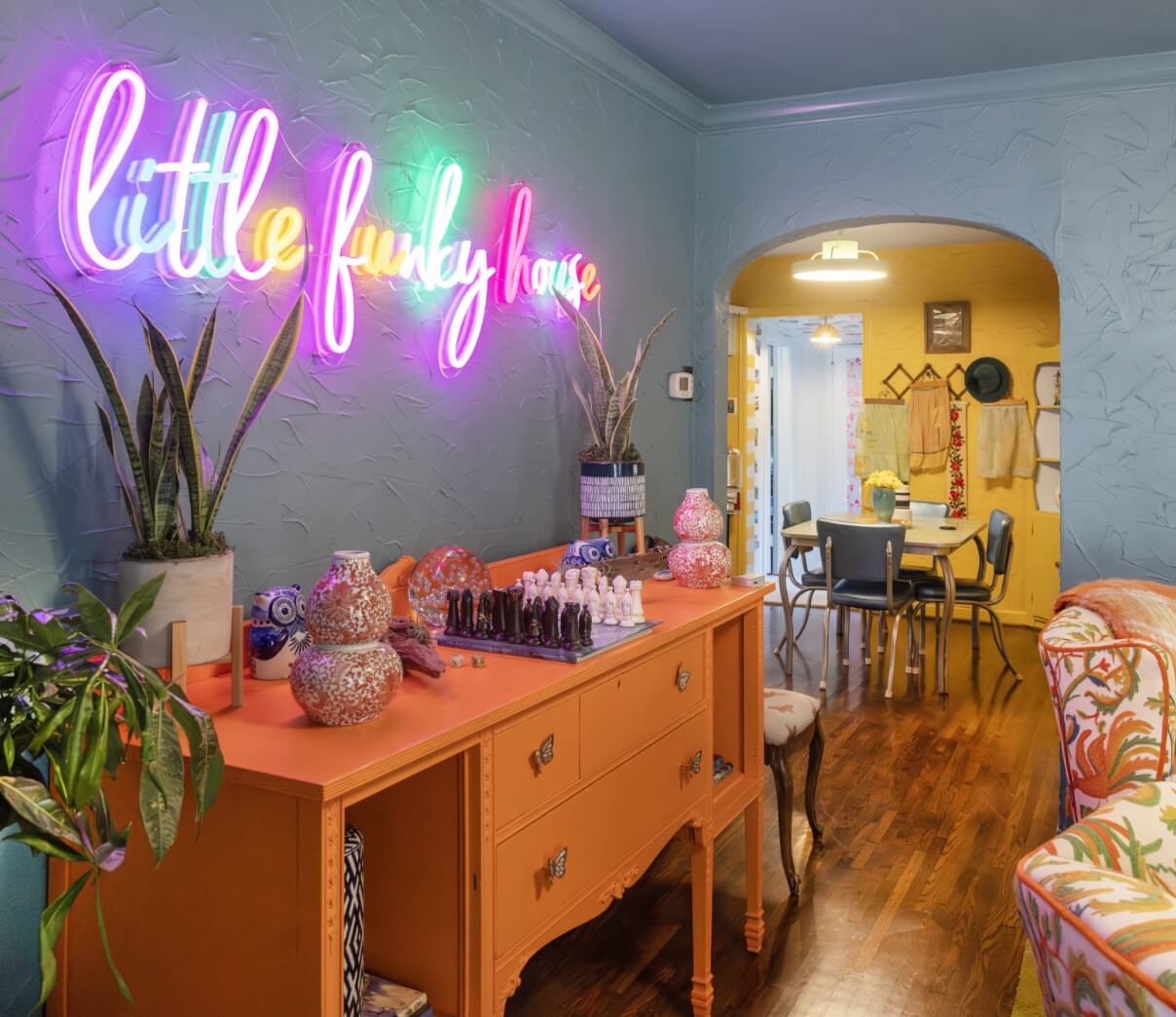 The view extends to the outside yard, dotted with colorful, nostalgic yard art that tells its own stories of time and place. Just beyond, a little library stands within sight — a cheerful landmark for neighbors walking their dogs, waving as they pass by.