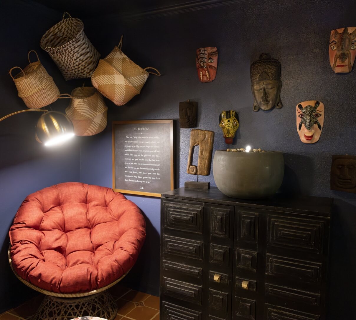 Breath Space is a haven designed to quiet the mind and open the spirit — a unique breathing space with a gentle namaste feel. The walls, painted in a deep dark blue, create an atmosphere of calm introspection. Unique and playful wall masks add touches of personality and surprise, while the soft murmur of a bubbling fountain fills the air with serenity.