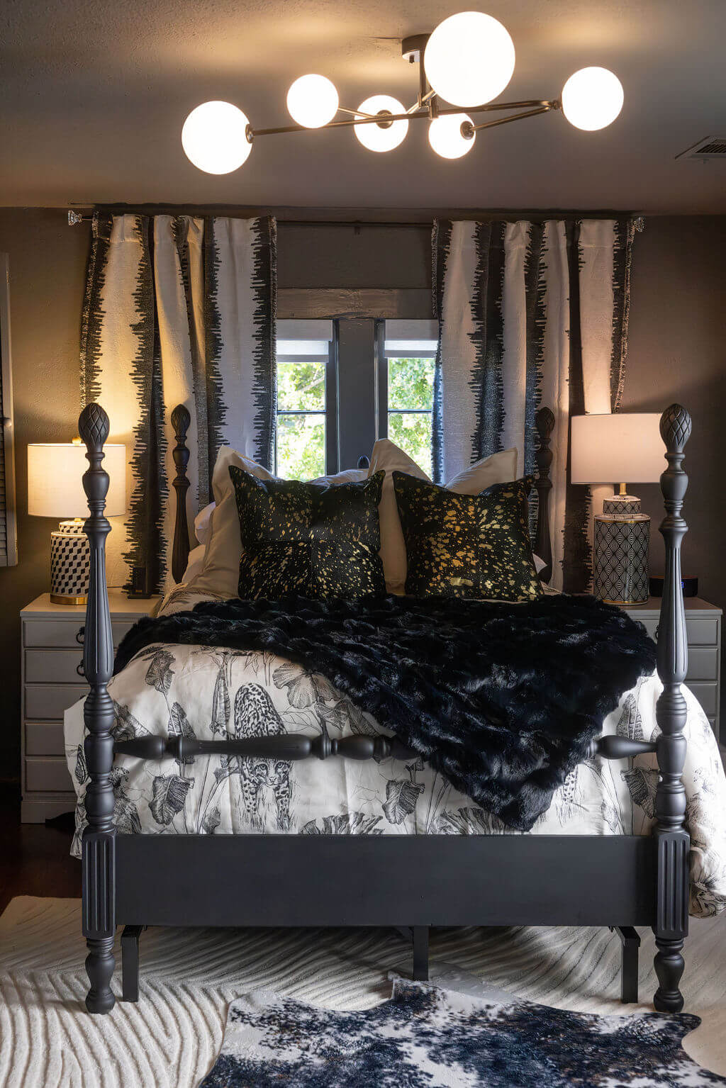 A full-size bed with a black-and-white print down-stuffed duvet blankets the resting spot, creating a cozy centerpiece for the room. Nearby, an extra sleeping nook offers a Japanese sleeping mat surrounded by oodles of pillows — a perfect place for a little one, an afternoon read, or quiet relaxation. Above, a playful disco ball doubles as the accent light, casting soft glimmers across the walls.