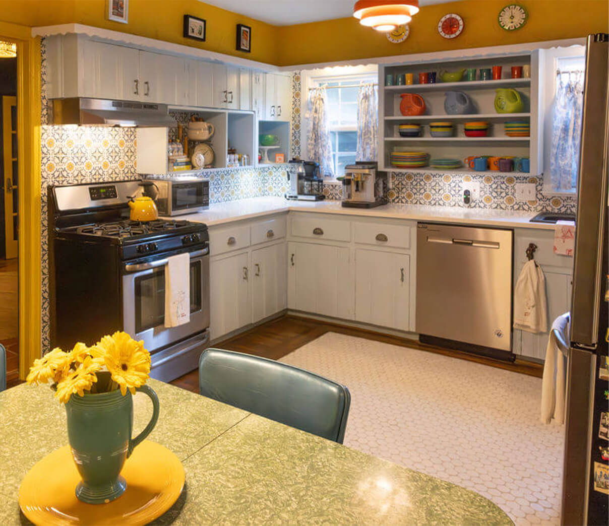 Sunlight pours across walls painted in a bright, cheerful yellow, dancing off a backsplash of Maioliche Autumn Yellow tiles. The space hums with life and color — antique cookie jars are housed in the yellow-and-blue built-in hutch, while shelves display a rainbow of Fiesta dishware. Light blue cabinets, set against original beadboard, bring a gentle coastal charm.