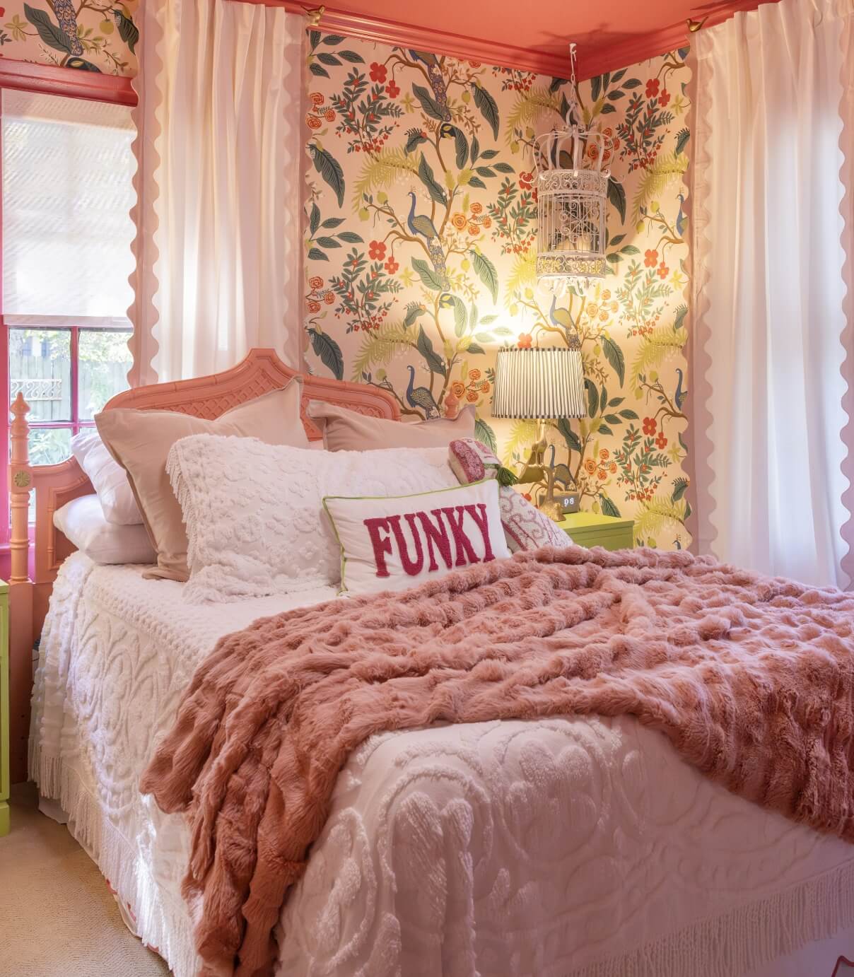 A pink and gold painted wicker dresser offers cheerful storage, paired with a cozy closet for hanging clothes. Here, it feels entirely natural — even encouraged — to feed the birds that lend the space its joyful spirit.